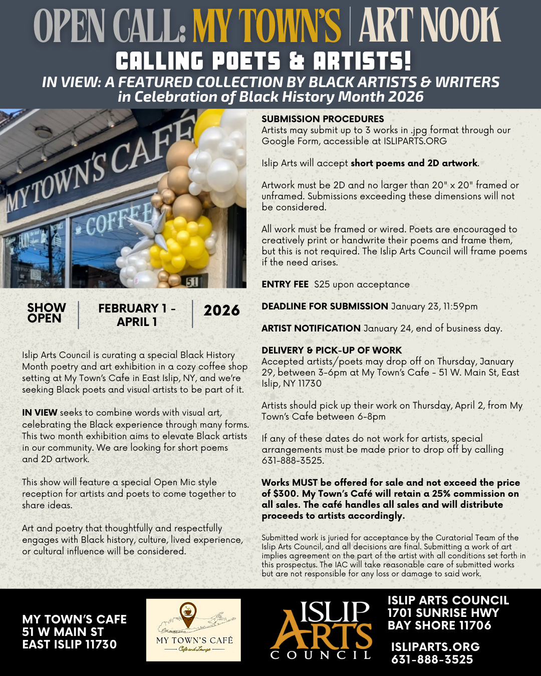 Islip Arts Council is curating a special Black History Month poetry + art exhibition in a cozy coffee shop setting - and we're seeking Black poets and visual artists to be part of it.