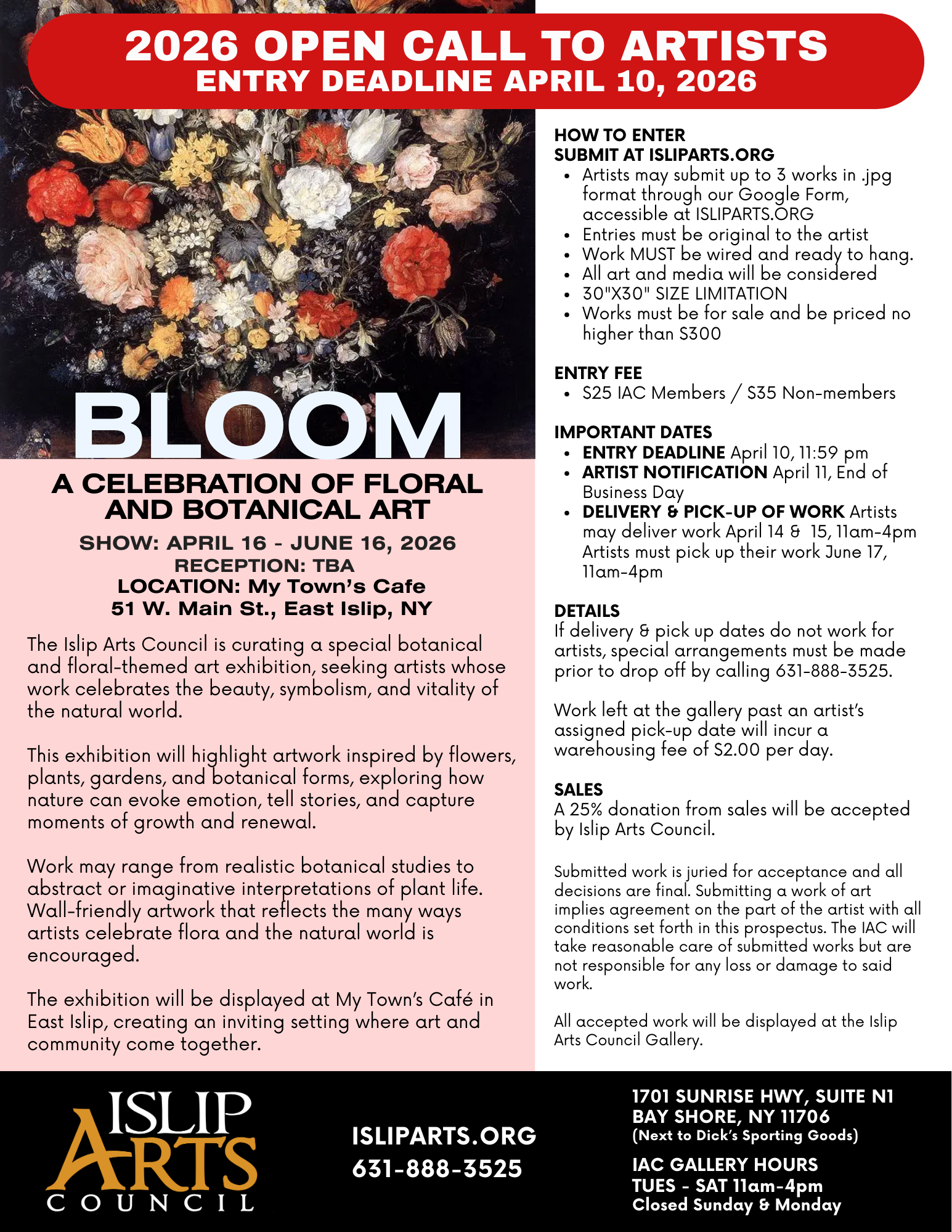 The Islip Arts Council is curating a special botanical and floral-themed art exhibition, seeking artists whose work celebrates the beauty, symbolism, and vitality of the natural world. This exhibition will highlight artwork inspired by flowers, plants, gardens, and botanical forms, exploring how nature can evoke emotion, tell stories, and capture moments of growth and renewal.