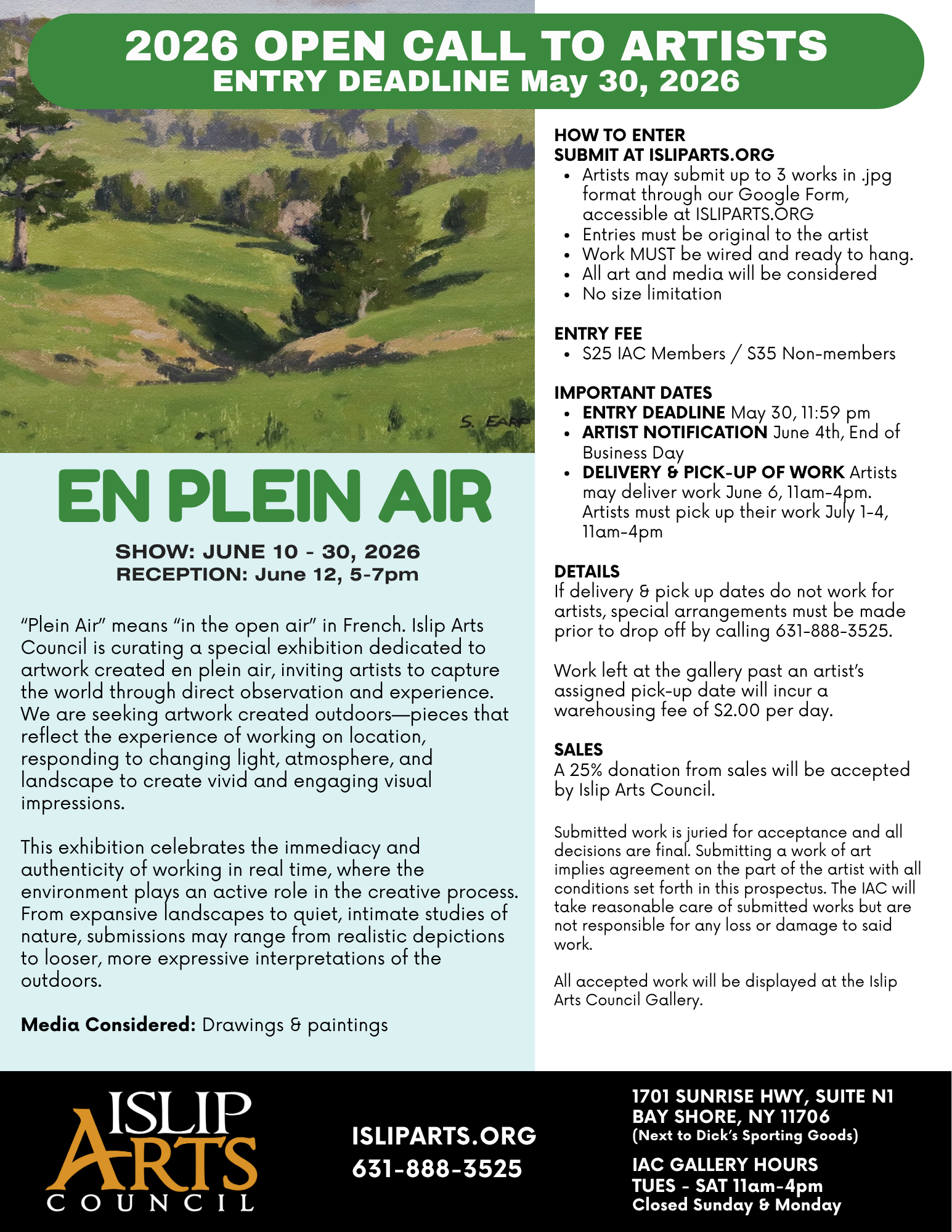 Submitted work is juried for acceptance by the Curatorial Team of Islip Arts Council, and all decisions are final. Submitting a work of art implies agreement on the part of the artist with all conditions set forth in this prospectus. IAC will take reasonable care of submitted works but are not responsible for any loss or damage to said work.